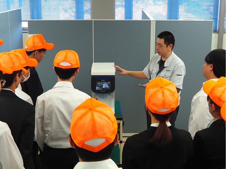 以前、同校で企業説明をさせていただいたことをきっかけに、その後ご入社いただいた卒業生が第一線で活躍中です。そのご縁で今回の工場見学が実現し、学生の皆様にも実際の「寿司ロボット作り」を体感していただきました。